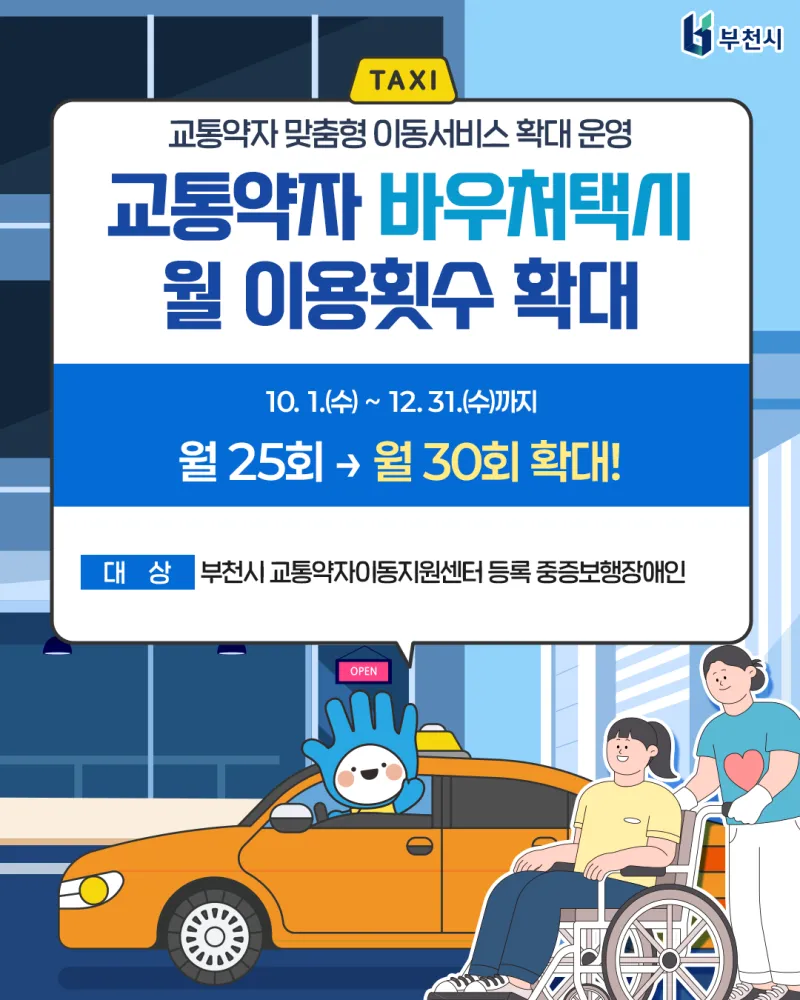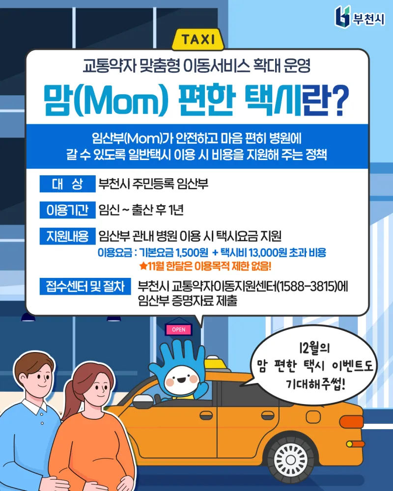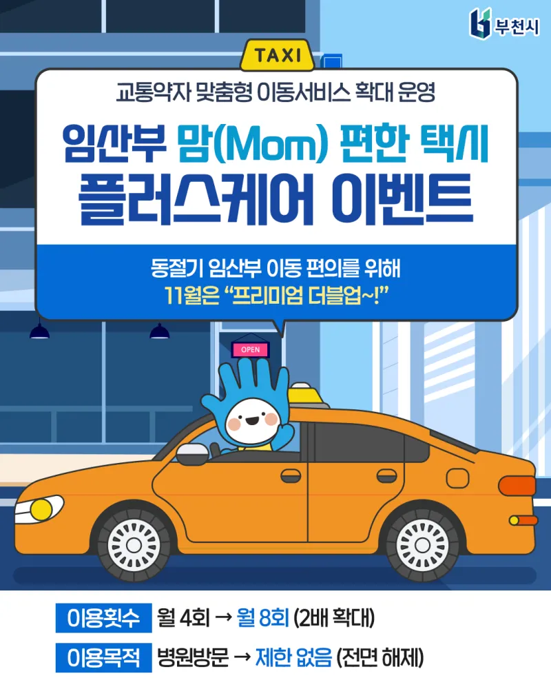 #부천 #부천시 #맘편한택시 #교통약자이동지원 #임산부지원정책 #부천맘 #출산준비 #부천복지 #바우처택시 #부천교통서비스 #중증보행장애인 #임산부혜택 #부천행정소식 #11월이벤트 #이동권보장 #복지도시부천 #엄마들을위한도시 #부천출산지원 #겨울이동복지 #프리미엄더블업 #교통약자지원서비스