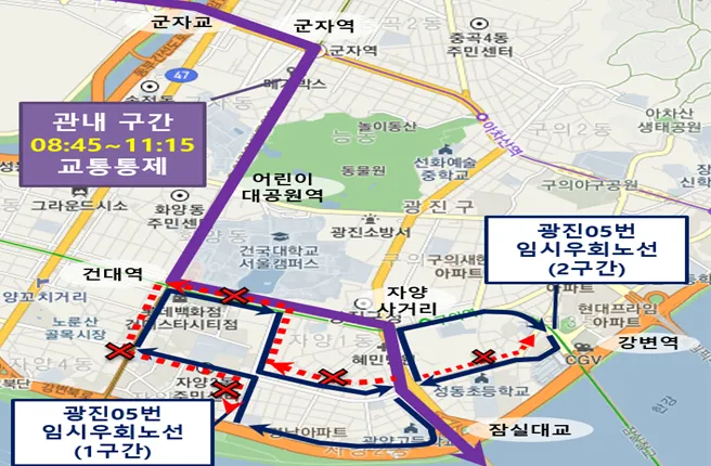 건대입구역->자양사거리->잠실대교 (통제) 08:45 (해제) 11:15 |