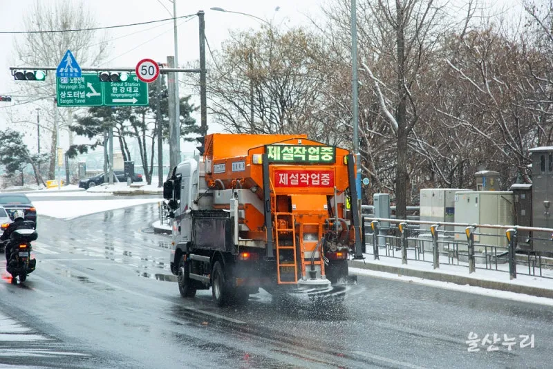 겨울철 눈이 내릴 경우 도로 정리와 안전을 위해 제설차를 운행하는 경우가 많습니다.