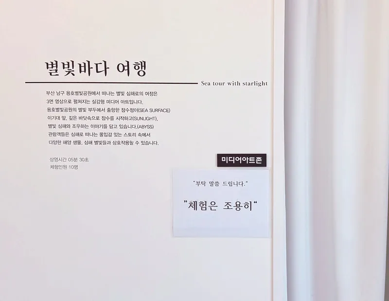 해양 생물과 심해의 별빛을 주제로 한 인터랙티브 미디어 아트 체험으로, 움직임이나 터치를 하며 생명체의 동작을 관찰할 수 있습니다.