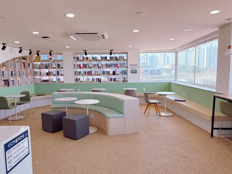 2층은 바다를 조망할 수 있는 오션뷰 힐링 라운지와 독서 공간으로 구성되어 있었습니다.