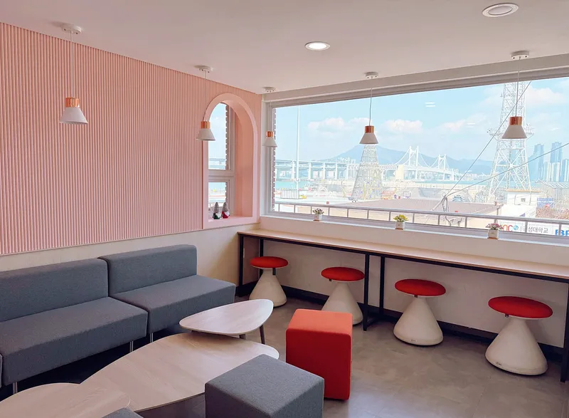 통창으로 보이는 부산 바다의 잔잔한 풍경을 보며 힐링할 수 있는 공간이라 혼자서 시간을 보내기에도 좋고, 잔잔한 분위기에서 책을 읽으며 사색을 즐기기에도 좋습니다.