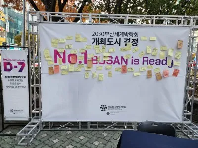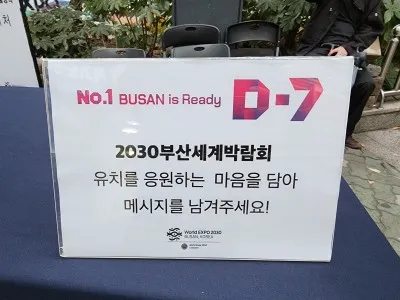 부산도시철도 서면역 10번 출구로 나오자 2030부산세계박람회 유치를 응원하는 마음을 담아 메시지를 남기는 코너가 마련되어 있었습니다.