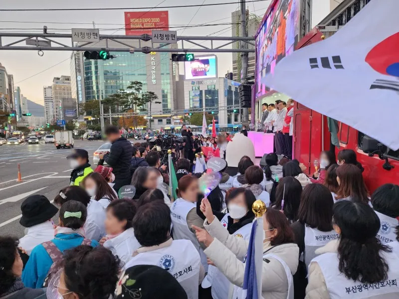 저도 응원 메시지를 남긴 후 사람들이 모여있는 곳으로 이동했습니다. 수많은 인파가 서면교차로 주변에 모여 2030 부산세계박람회 유치 응원송에 맞춰 흥겹게 노래를 따라 부르고 있었습니다. 교차로 인근에 운행하는 차량이 많기 때문에 응원하는 시민들의 안전을 위해 경찰이 행사장 주변을 통제하며 원활하게 진행되었습니다.