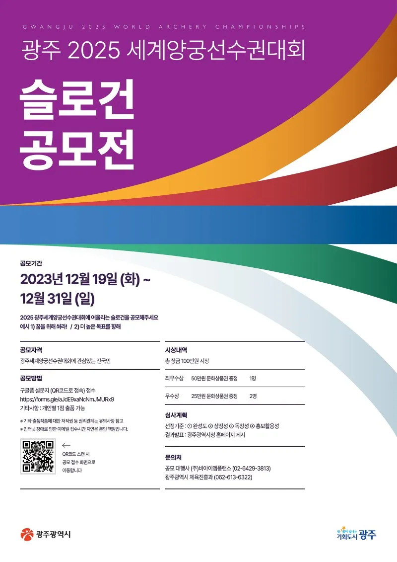 「광주 2025 세계양궁선수권대회」 홍보에 효과적인 상징물을 개발하고자 슬로건 공모전을 다음과 같이 실시하오니 관심 있는 분들의 많은 참여 바랍니다. ● 대 상 : 광주세계양궁선수권대회에 관심 있는 전국민 ● 시 상 최우수상 : 1명, 50만원 문화상품권 증정 우 수 상 : 2명, 25만원 문화상품권 증정 ● 기타사항 - 개인별 1점 출품 가능 - 기타 출품작품에 대한 저작권 등 권리관계는 유의사항을 참고하여 주시기 바랍니다. 사업주관 : 광주광역시 조사기관 : 비아이엠플랜스