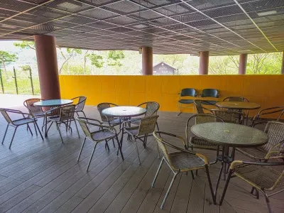 야외 테이블과 의자가 세팅되어 있습니다. 🍟🌭