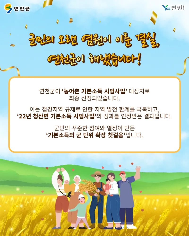 연천군이 ‘농어촌 기본소득 시범사업’ 대상지로 최종 선정되었어요.