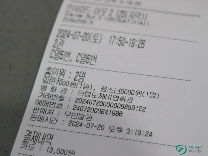 아이와 의령여행에서 의령도깨비영화관 방문을 빼놓지 않은 이유는 '인사이드아웃 2' 영화를 보기 위해서였답니다. 의령도깨비영화관 영화 관람료는 2D 7,000원, 3D 9,000원이며 청소년은 6,000원으로 일반 영화관에 비해 절반 수준의 가격으로 최신 영화를 즐길 수 있습니다.