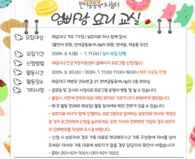 반여공동육아나눔터는 해운대구 거주 12세 미만 자녀 가정 누구나 이용 가능하다고 합니다. 특히, 품앗이 그룹 활동 진행은 활동비 지급과 상시 프로그램 우선권 등이 있어서 홍보물이 눈길을 끌었습니다.