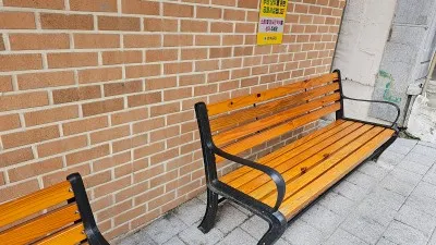 출입구 옆에 벤치에는 오고 가는 주민들이 잠깐 쉬어가는 벤치였습니다. 반여 3동의 얕은 오르막길이라 어르신들이 잠깐 쉬어가는 모습을 볼 수 있었습니다.