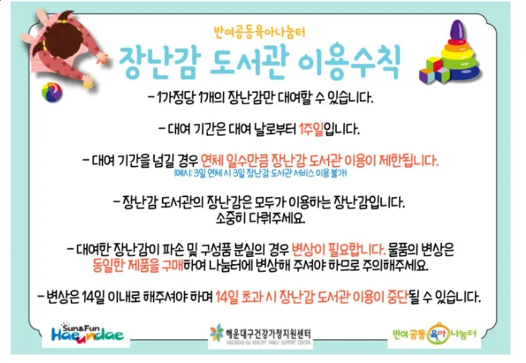 장난감 도서관 이용 수칙을 꼭 읽으시고, 많은 아이들이 가지고 놀 수 있도록 소중히 다루어 주시면 감사하겠습니다.