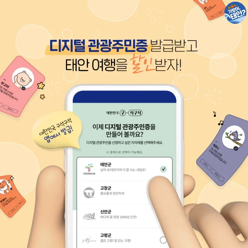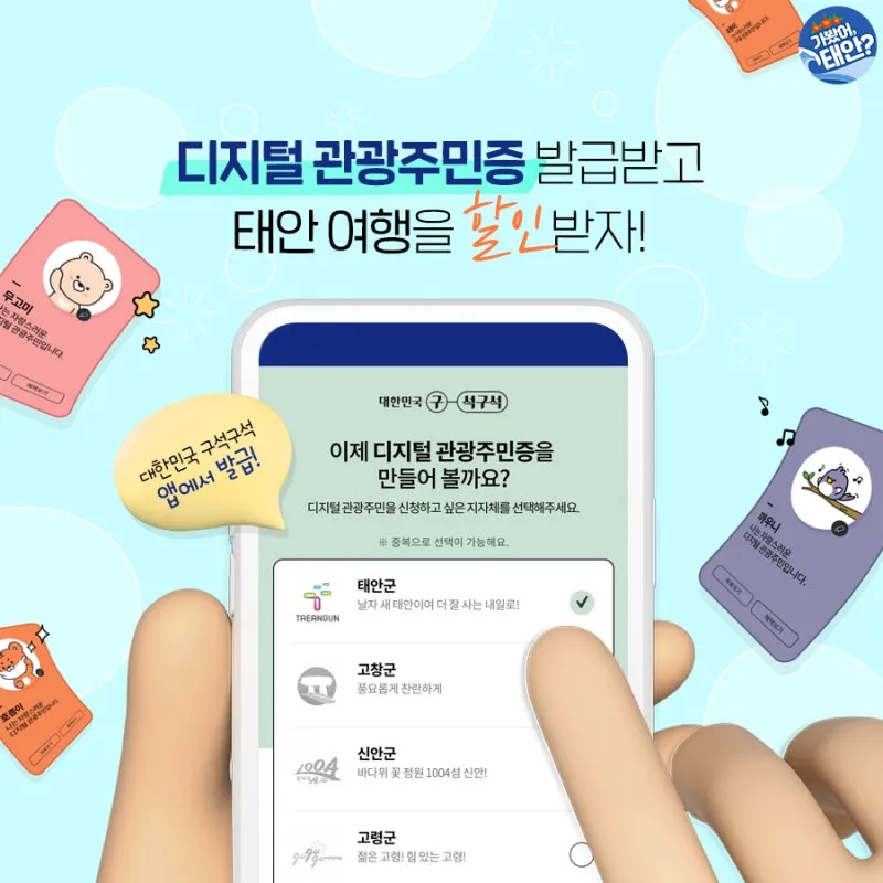 태안 여행지 내에 비치된 디지털관광주민증 QR코드를 스캔하거나 대한민국 구석구석 앱을 다운로드 후 디지털관광주민증을 발급받을 '태안군'을 선택하면 간단하게 발급 완료! 디지털관광주민증으로 태안 여행 할인증을 발급받아 제시하면 빠르게 할인 혜택을 받을 수 있습니다.