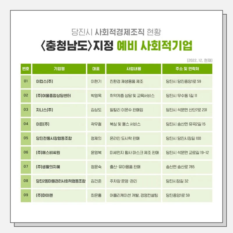 이컵스(주), (주)여울종합상담센터, 지니스(주), 이든(주), 당진전통시장협동조합, (주)에스비씨원, (주)생활의지혜, 당진2동마을관리사회적협동조합, (주)마이렌 |