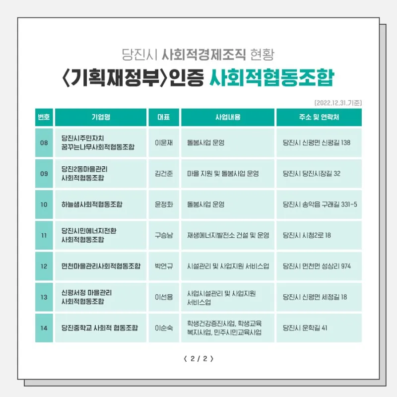 푸른농업사회적협동조합, 환경인사회적협동조합, 당진시민에너지사회적협동조합, 초록별교육사회적협동조합, 당진고등학교사회적협동조합, 가온누리사회적협동조합, 합덕아동사회적협동조합, 당진시주민자치꿈꾸는나무사회적협동조합, 당진2동마을관리사회적협동조합, 하늘샘사회적협동조합, 당진시민에너지전환사회적협동조합, 면천마을관리사회적협동조합, 신평서정 마을관리 사회적협동조합, 당진중학교 사회적 협동조합 |