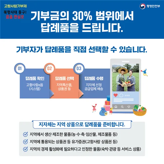 ✔답례품 : 기부금액의 30%(예 : 10만원 기부시 3만원 상당 답례품)