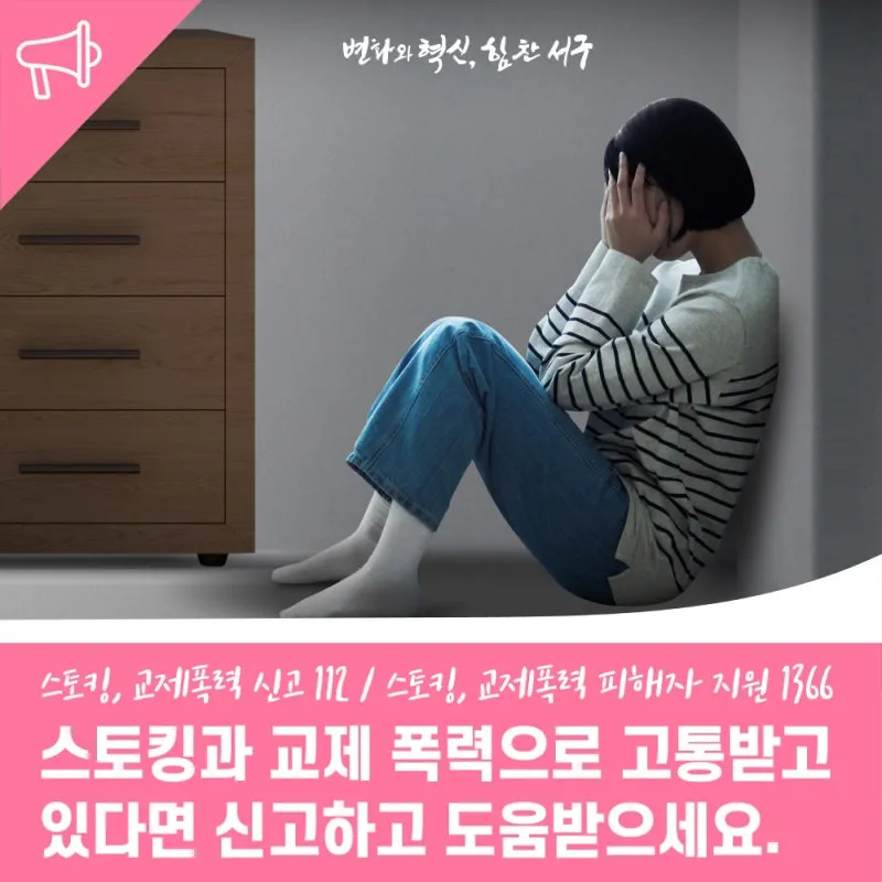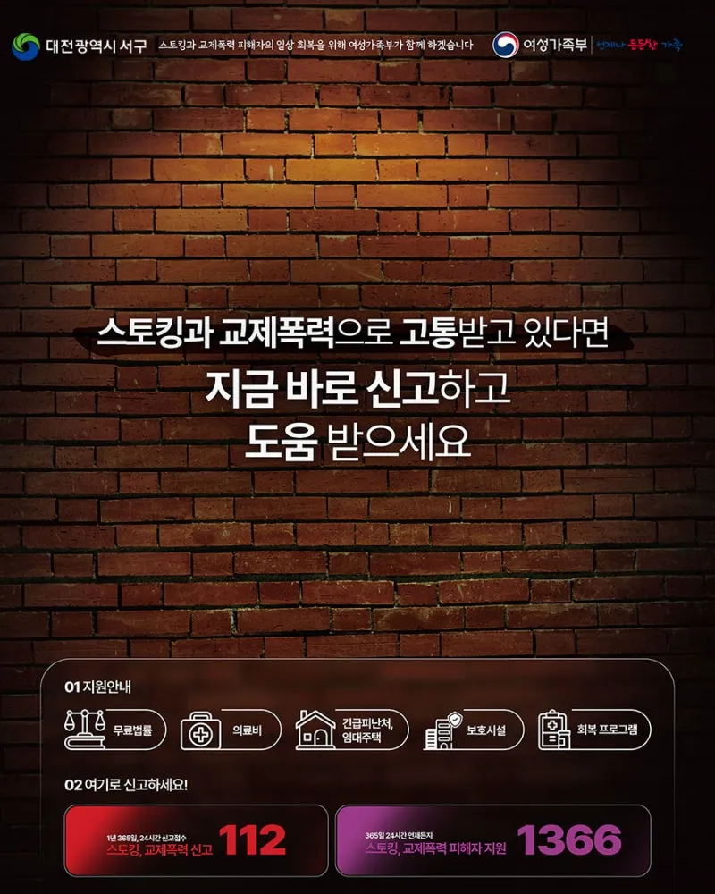 스토킹과 교제폭력 피해자의 일상 회복을 위해 대전서구와 여성가족부가 함께 하겠습니다.