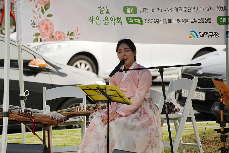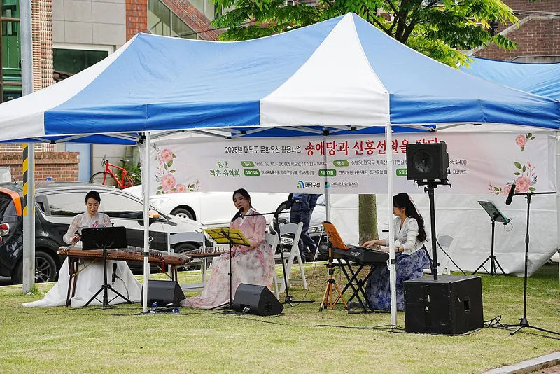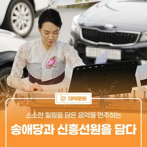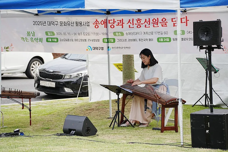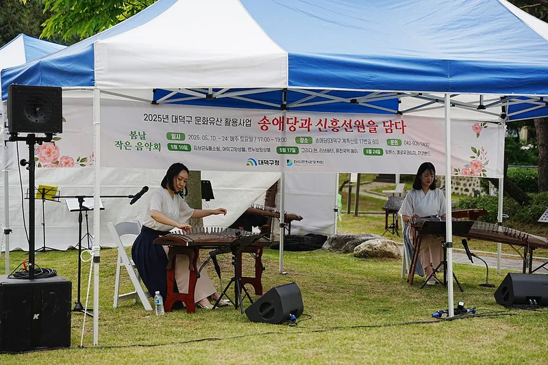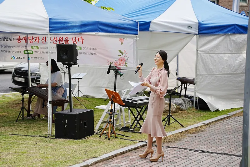 대덕구청과 대덕문화관광재단에서 2025년 대덕구 문화유산 활용사업으로 구민과 가까운 곳에서 공연을 즐기는 행사를 진행하고 있습니다. 5월에는 대덕구 중리동의 송애당에서 세 차례의 공연이 펼쳐졌고, 9월과 10월에는 대청로의 신흥선원에서 산사에서 힐링하는 체험 행사가 진행됩니다.
