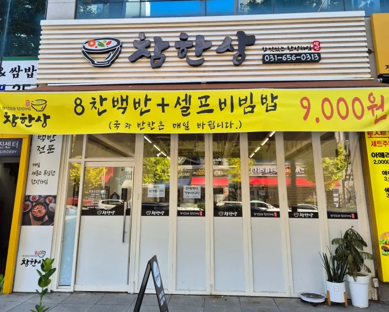 매일 달라지는 국과 8가지 반찬, 셀프 비빔밥을 9,000원에 즐길 수 있습니다.