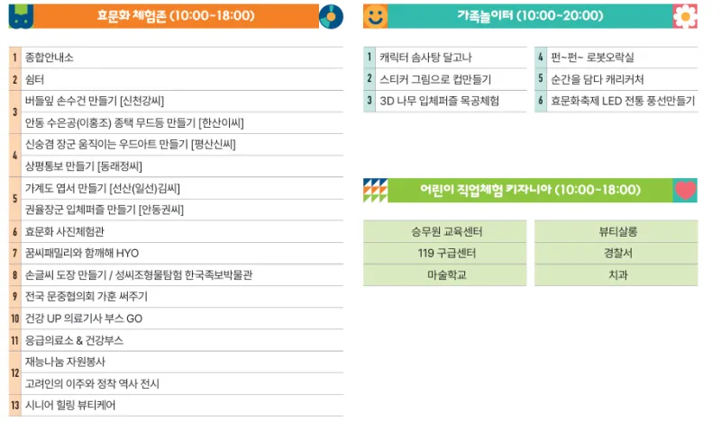 가족놀이터, 직업체험 키자니아 등으로 나누어져 있어요