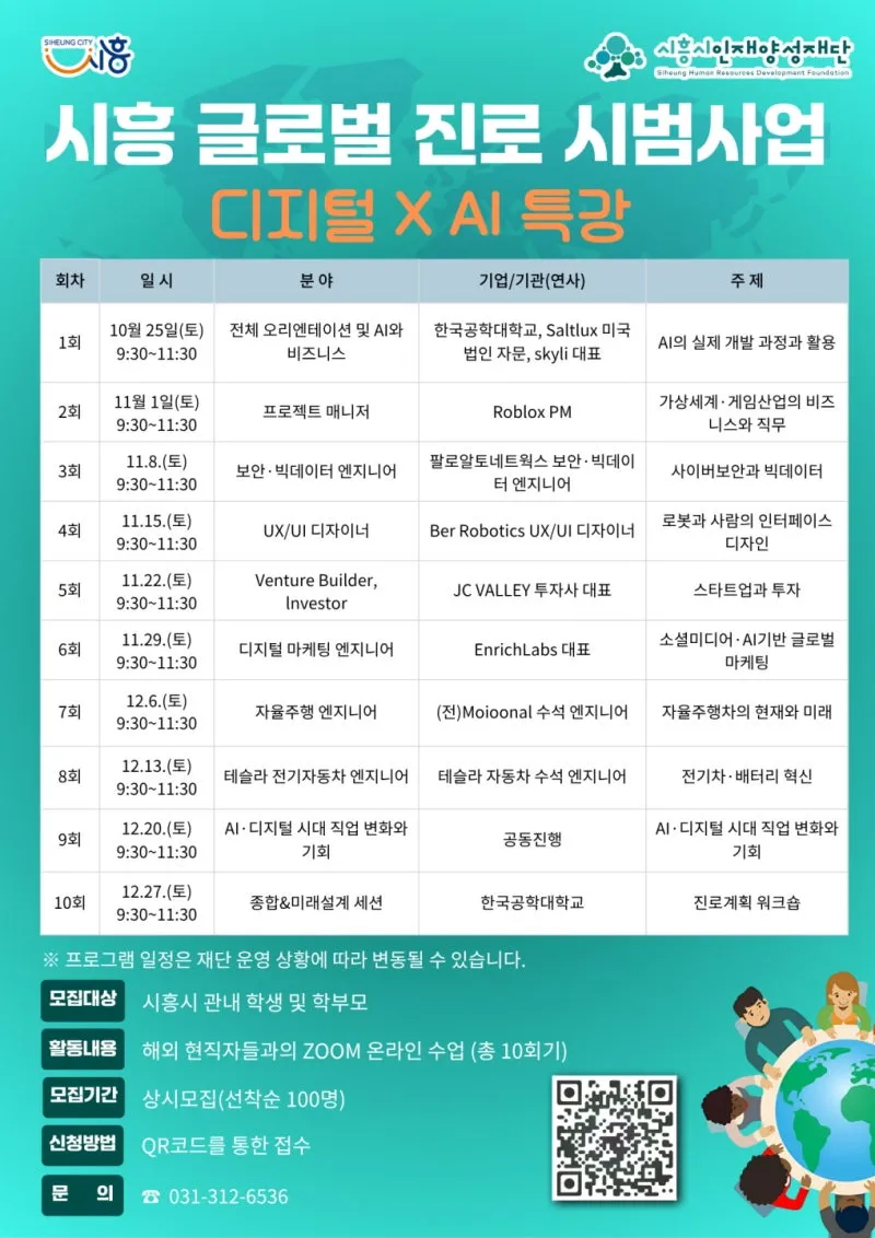 이번 사업은 시흥시 청소년의 글로벌 역량을 강화하기 위한 시범 프로그램으로, 글로벌 전문가와 함께 인공지능(AI), 자율주행, 빅데이터 등 첨단기술 사례를 학습하며 미래 산업에 대한 이해를 넓히고 진로 탐색의 기회를 제공합니다.