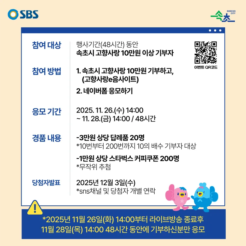 ????제1회 SBS 고향사랑기부제 속초시 대상 수상 기념 라이브방송 이벤트 안내????