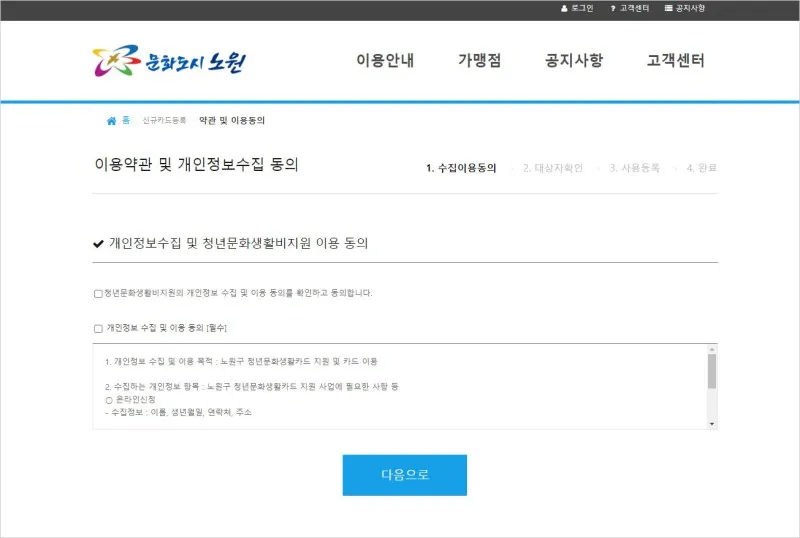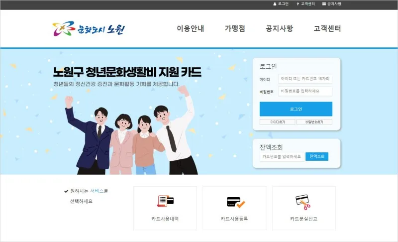 노원구 청년문화생활비 신청 홈페이지 내 등록된 가맹점에서 사용할 수 있는 바우처 카드 지급