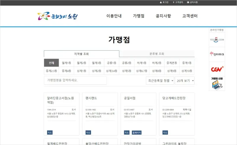 노원구 청년문화생활비 신청 홈페이지 > 가맹점 > 지역별 or 분류별 조회