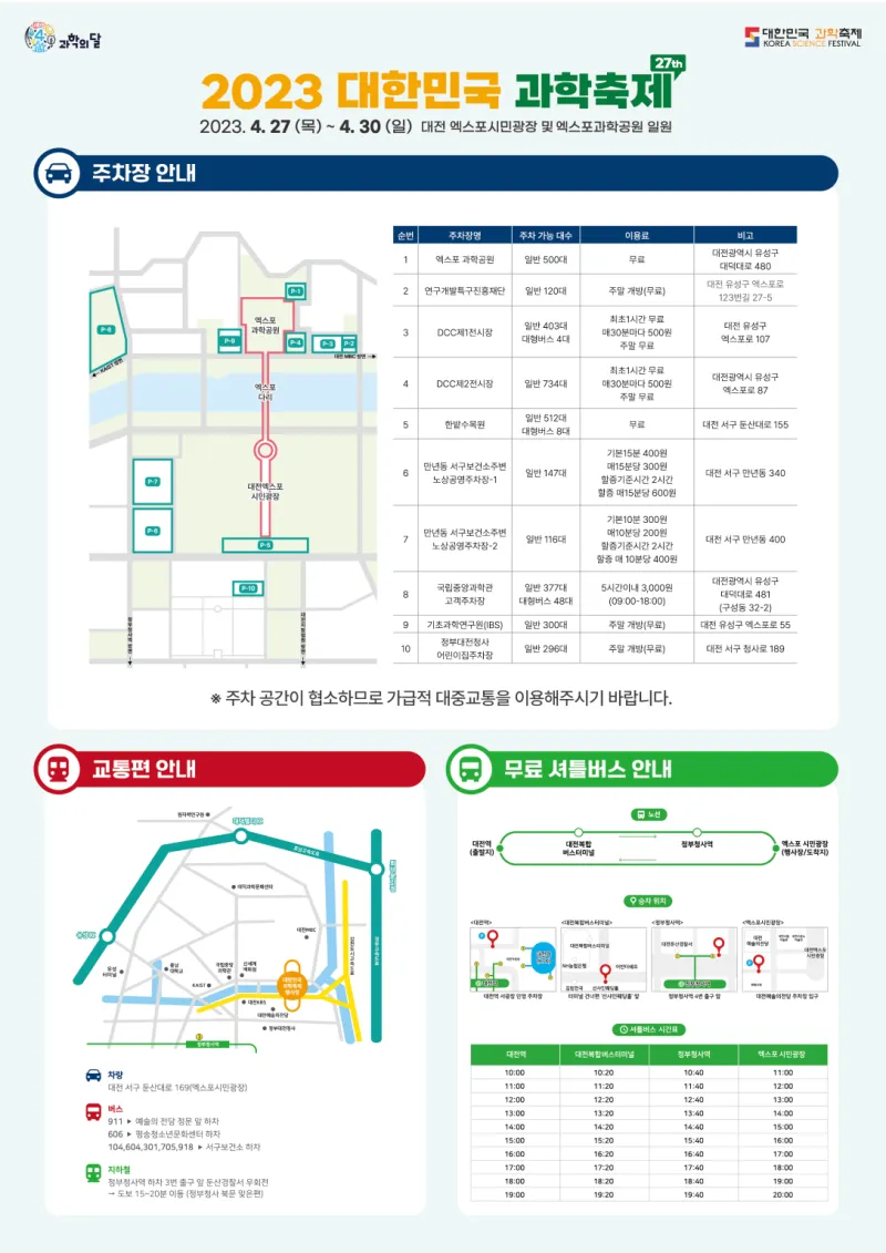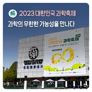 '2023 대한민국 과학축제'는 대한민국을 대표하는 과학축제로 4월 27일부터 4월 30일까지 대전 엑스포시민광장 및 엑스포 과학공원 일원에서 개최되는데요. 많은 정부출연연구기관이 참여하며, 다양한 기업들도 참여해 과학 기술을 선보인답니다. 과학기술과 미래, 연결, 공존, 도시를 주제로 첨단 과학기술과의 공존과 일상화된 미래 과학기술을 한 자리에서 만나보시면 어떨까요?
