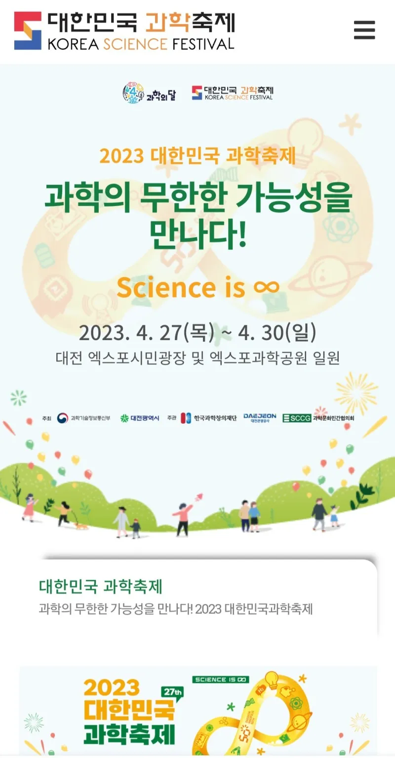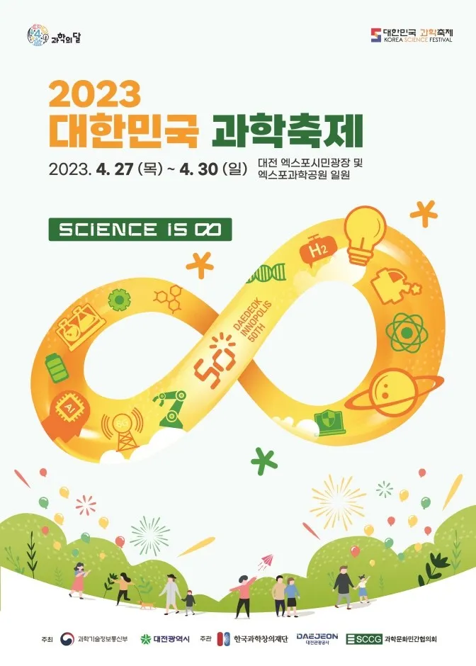올해로 27회를 맞이한 2023 대한민국 과학축제는 전 국민이 과학기술을 통하여 도시와 삶이 공존하고 미래로 연결되는 무한한 가능성을 만난다는 'Science is ∞'라는 슬로건 아래 과학기술, 미래, 연결, 공존, 도시를 주제로 마련되었답니다.