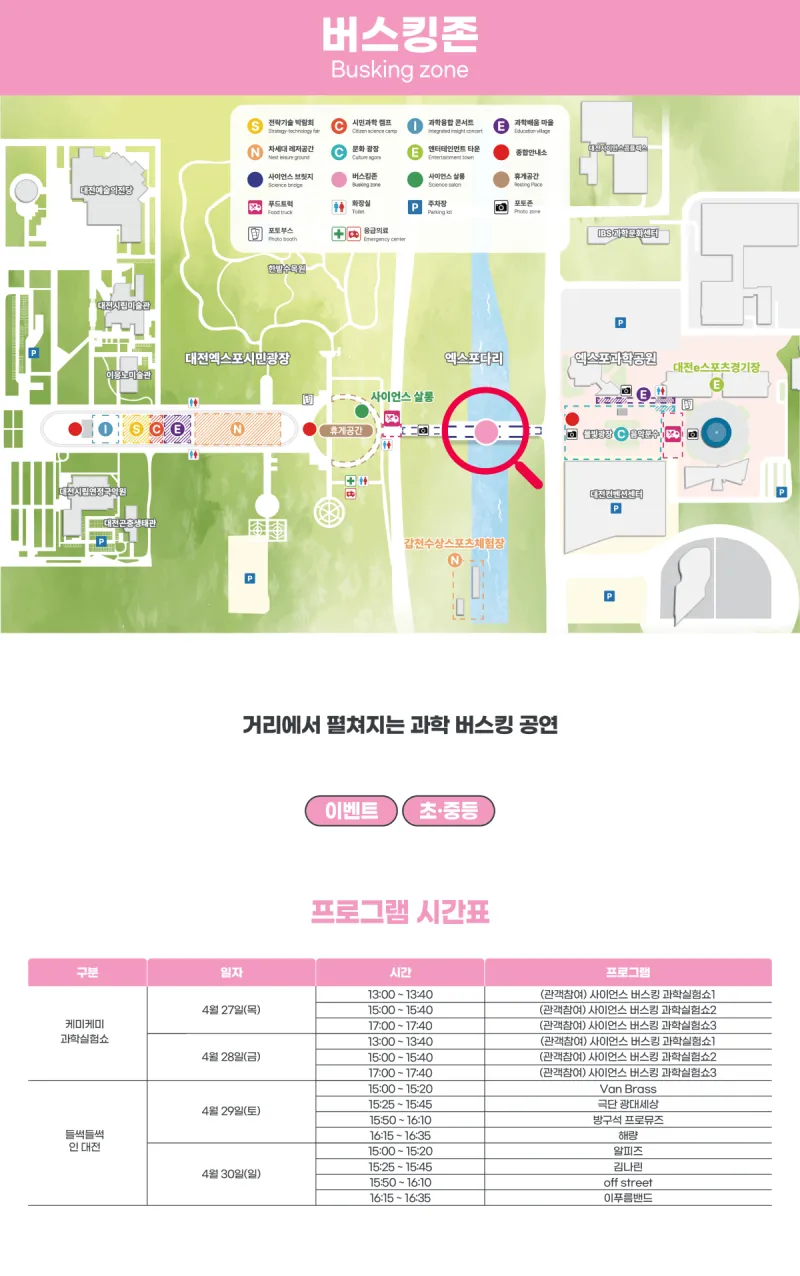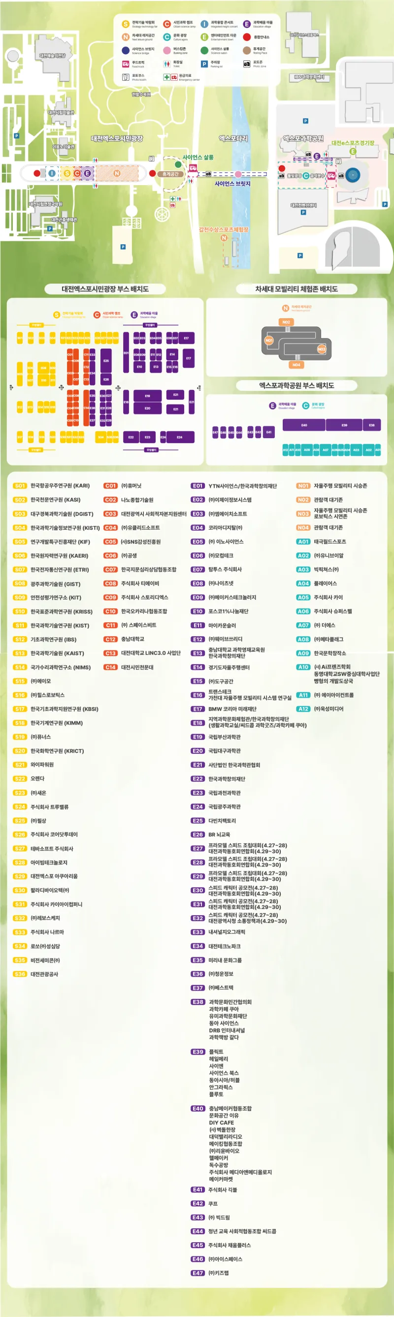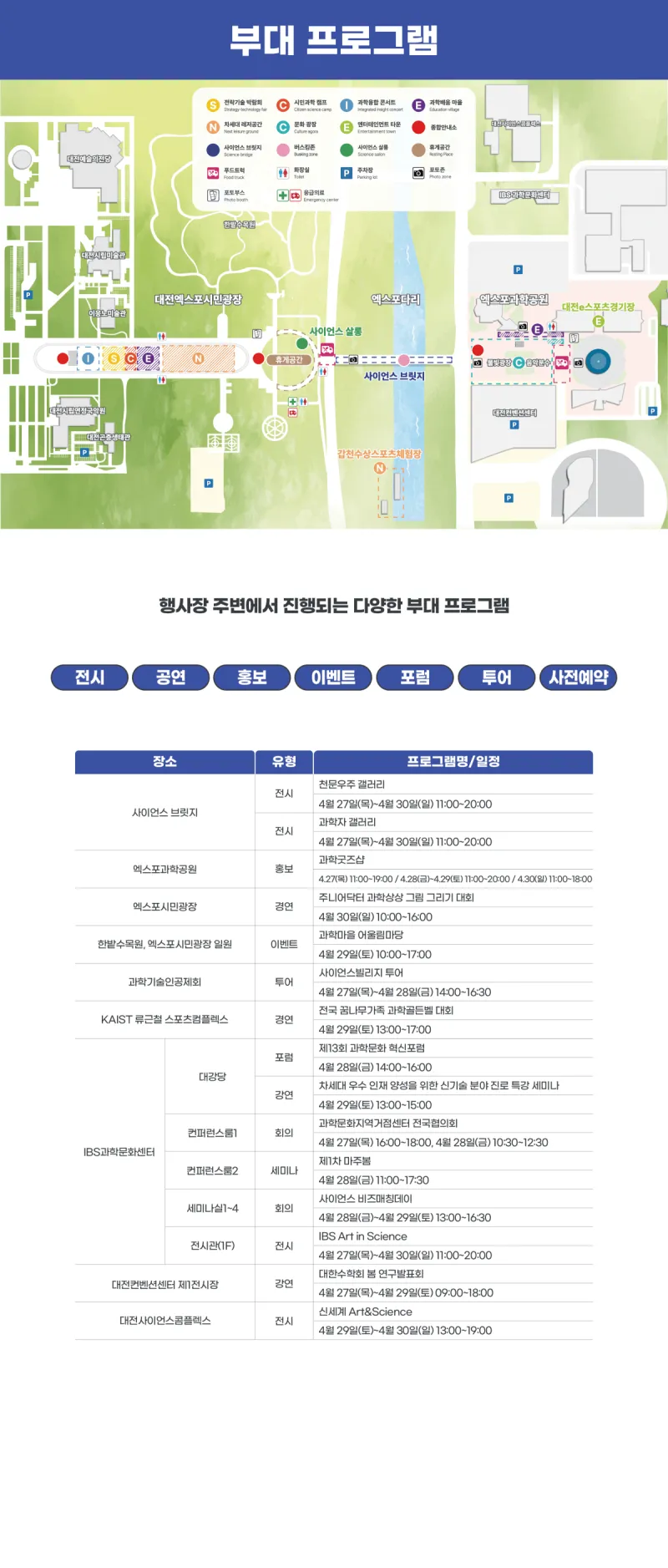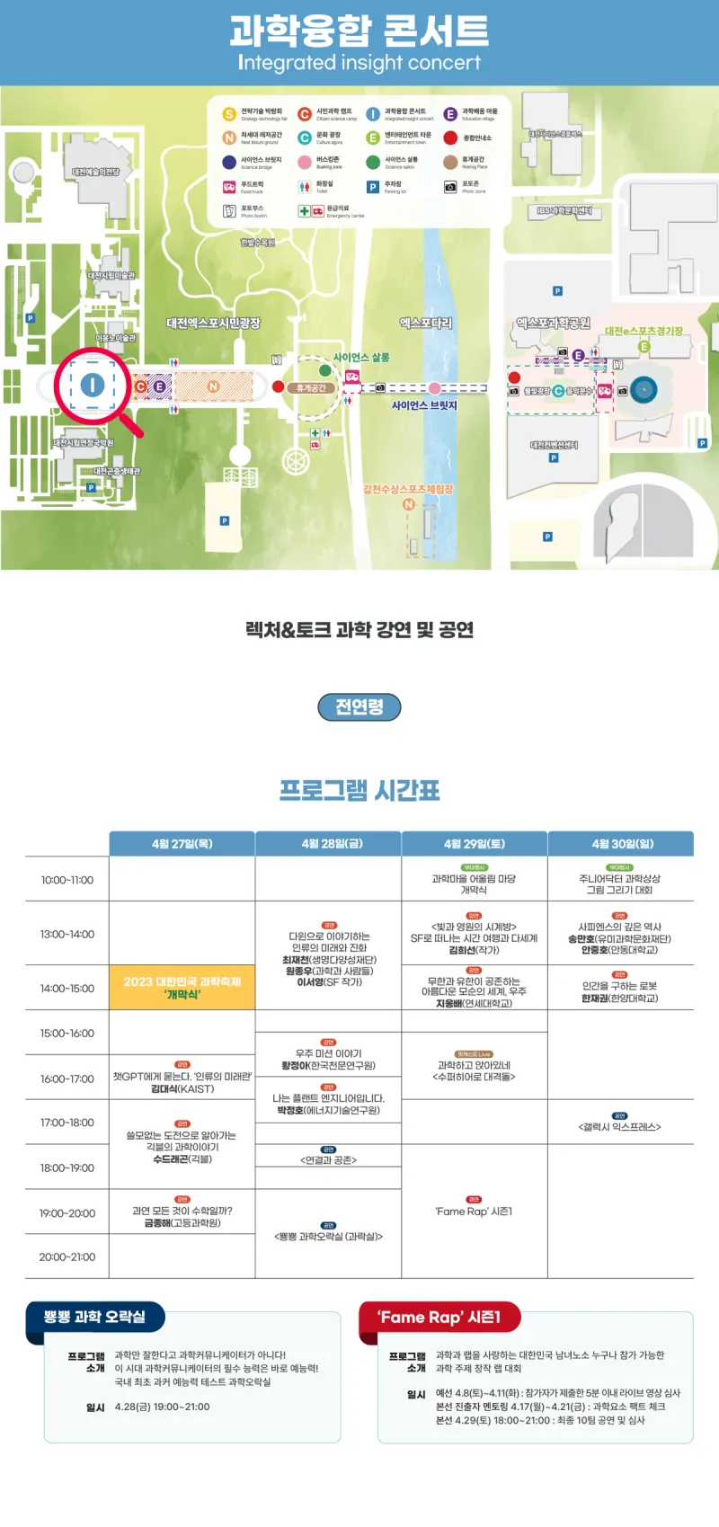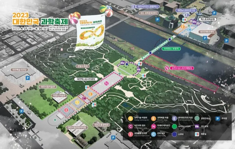 과학축제 프로그램은 과학의 영문 표기인 사이언스(science)의 7개 철자를 활용해 전략기술박람회, 시민과학 캠프, 과학융합 콘서트, 과학배움마을, 차세대 레저 공간, 문화광장, 엔터테인먼트 타운 등 7개 공간을 조성했다고 하는데요.