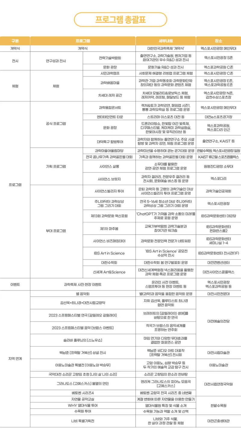 행사내용을 살펴보면 개막식, 정부출연연구기관 부스, 기업 부스, 과학 체험 부스, 과학실험쇼, 드론라이팅쇼, 레저 카약, 래프팅, 페달보트, 디쿠페스티벌, 천체사진공모전 수상작 전시, 과학기술유공자 50인 전시, 야시장&뮤직콘서트, 야간 경관 조명, 과학 콘텐츠 조명, 과학체험 특강, 스트리머 대전&팬사인회, 과학 전시회, 포럼, 워크숍, 과학 연극, 골든벨 대회, 공작교실, 대전시립교향악단 공연, 과학 상상 그리기 대회, 천체 관측, 대전테마여행 등이 있답니다.