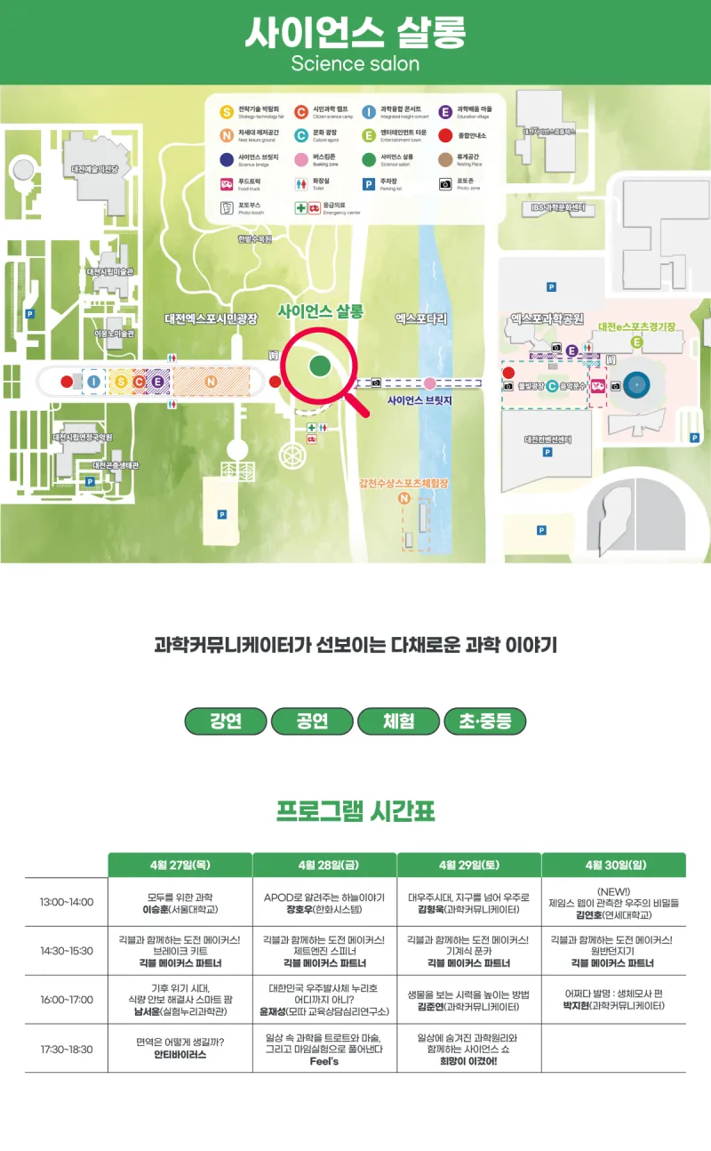 비수도권에서는 최초로 대전에서 개막된 대한민국 과학축제에 참여하여, 다채로운 과학문화 프로그램과 함께 4월 과학의 달을 마무리해보면 어떨까요?