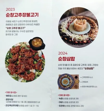 순창군은 순창의 대표 음식 장류를 이용한 새로운 요리를 2023년에는 순창고추장불고기와 2024년에는 순창삼합을 선보였습니다.