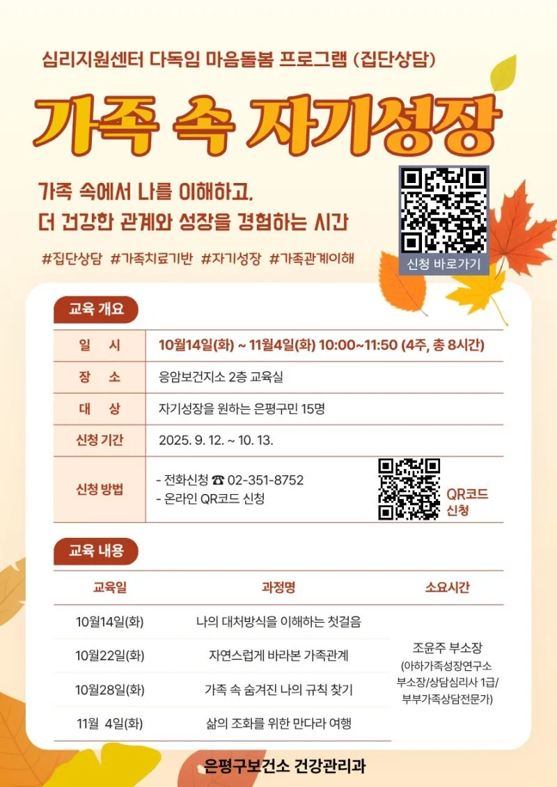 은평구 심리지원센터 심리프로그램(집단상담) "가족 속 자기성장"