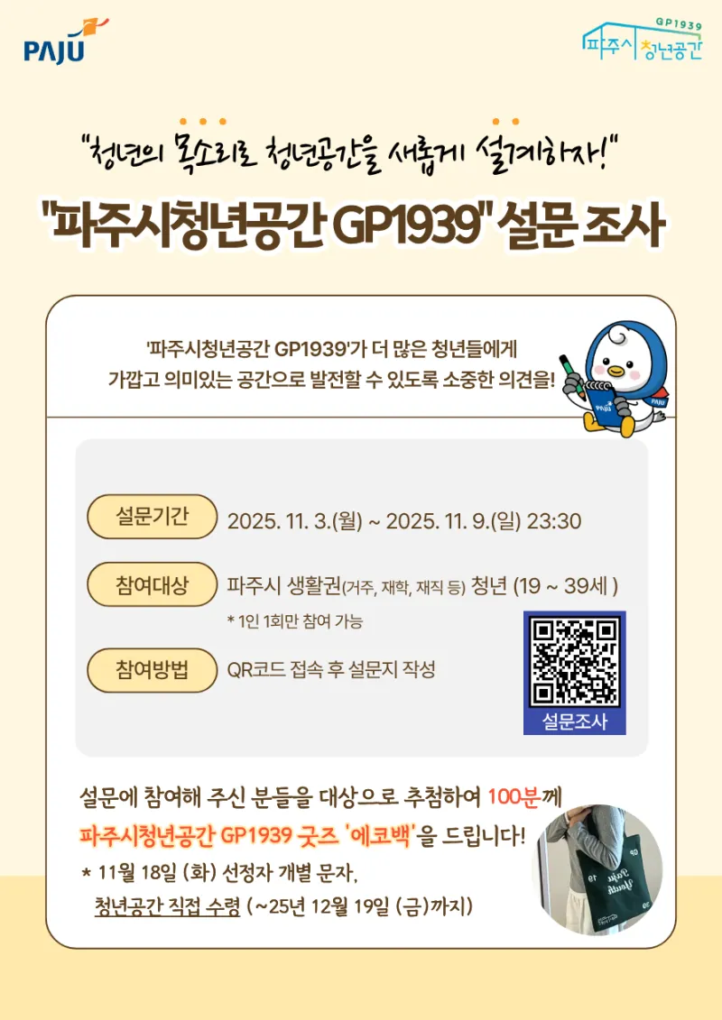 파주시청년공간 GP1939 굿즈 '에코백'을 드립니다.