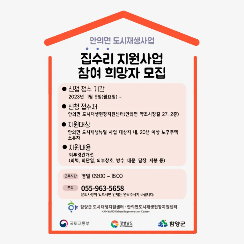 안의면 도시재생사업 및 집수리지원사업 관련 궁금한 사항은 안의면 도시재생현장지원센터로 언제든 문의주세요.
