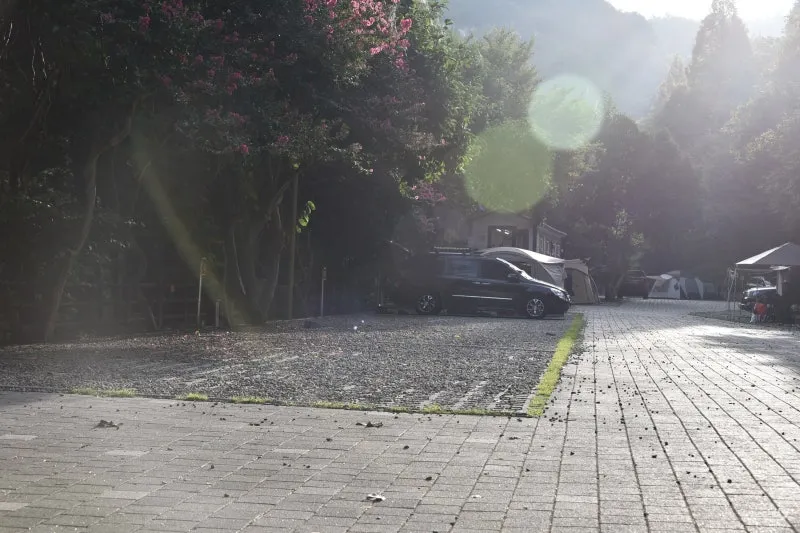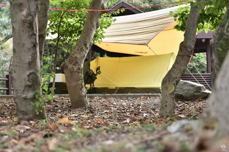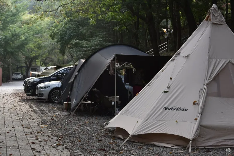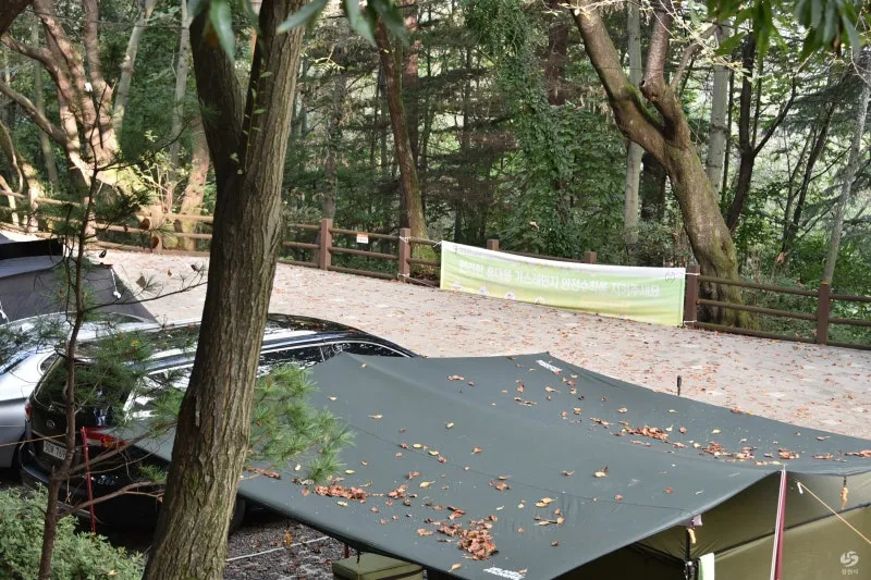 갈색과 황금빛으로 물들어가는 잎사귀들이 바닥에 쌓이는 모습은 캠핑장의 분위기를 한층 더 운치 있게 만들어 줍니다.