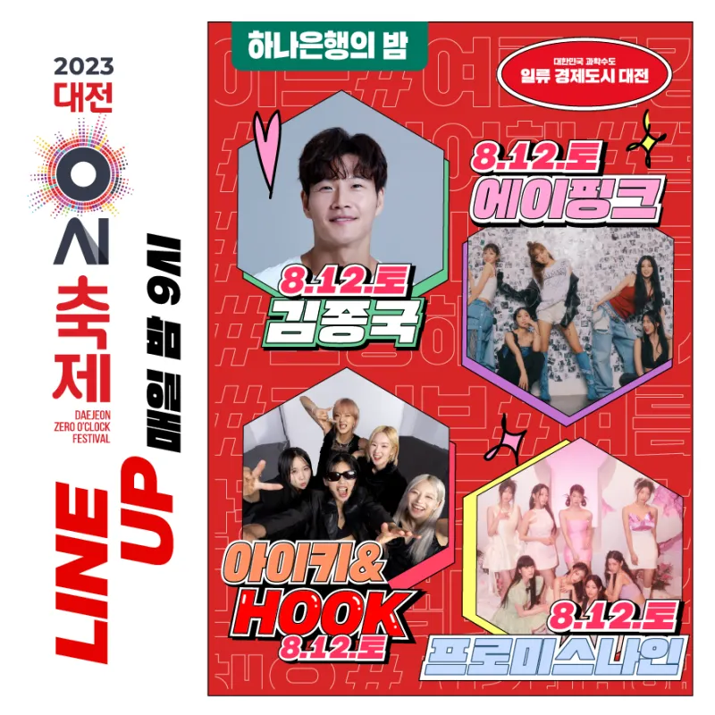 대전 0시 축제 K-POP 콘서트의 라인업이 확정되었습니다!! 대전 0시 축제가 열리는 8월 11일부터 17일까지 매일 밤 색다른 테마로 중앙로역 네거리에 설치된 특설무대에서 국내 최정상급 뮤지션들이 K-POP 공연을 펼칩니다. 많은 분들의 관심과 성원 부탁드립니다!!