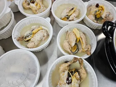 메뉴는 전복이 들어간 삼계탕과 장조림 그리고 귤이었어요. :)