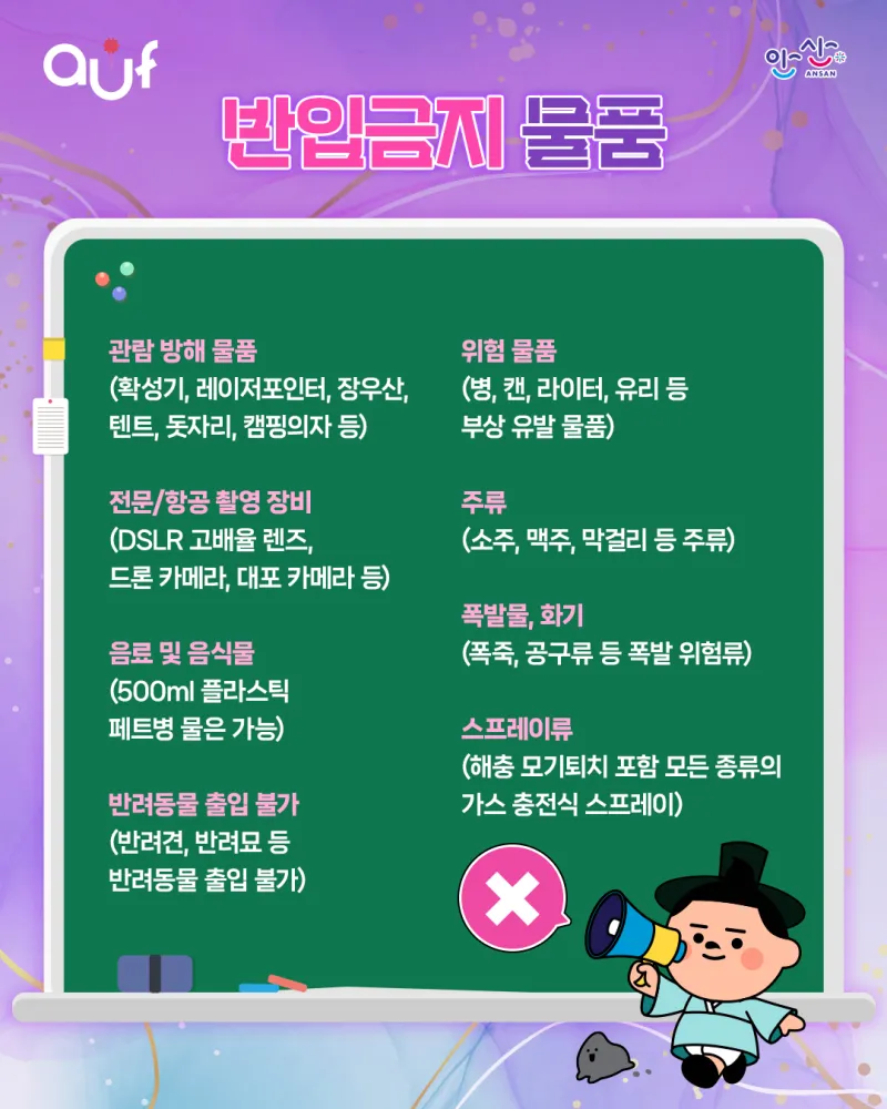 - 관람 방해 물품(확성기, 레이저포인터, 장우산, 텐트, 돗자리, 캠핑의자 등)