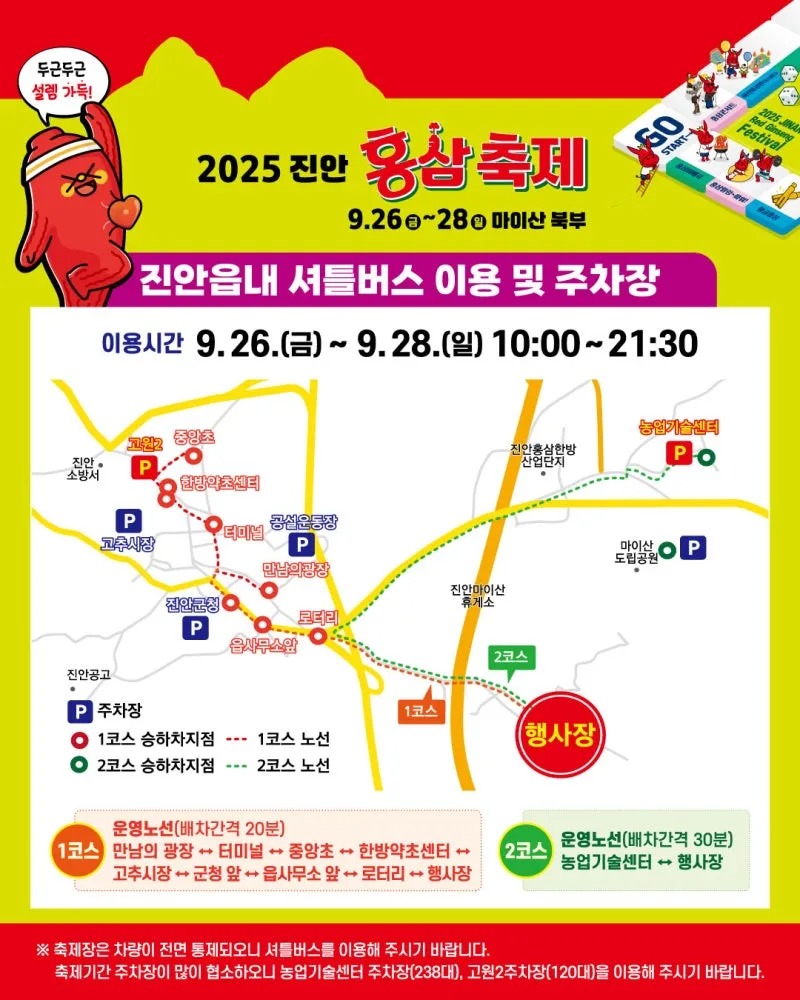 <1코스> 만남의 광장 ↔ 터미널 ↔ 중앙초 ↔ 한방약초센터 ↔ 고추시장 ↔ 군청 앞 ↔ 읍사무소 앞 ↔ 로터리 ↔행사장