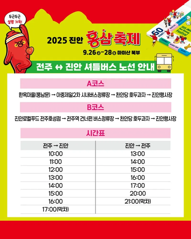 ▶ 전주↔진안 셔틀버스 이용안내 : 9월 26일(금) ~ 9월 28일(일) / 3일간 / 10:00 ~ 21:00