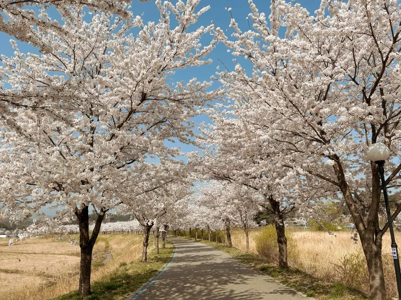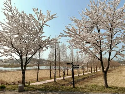 벚꽃길이 풍성한 곳에 호수가 보여 포토스팟으로도 좋아요.