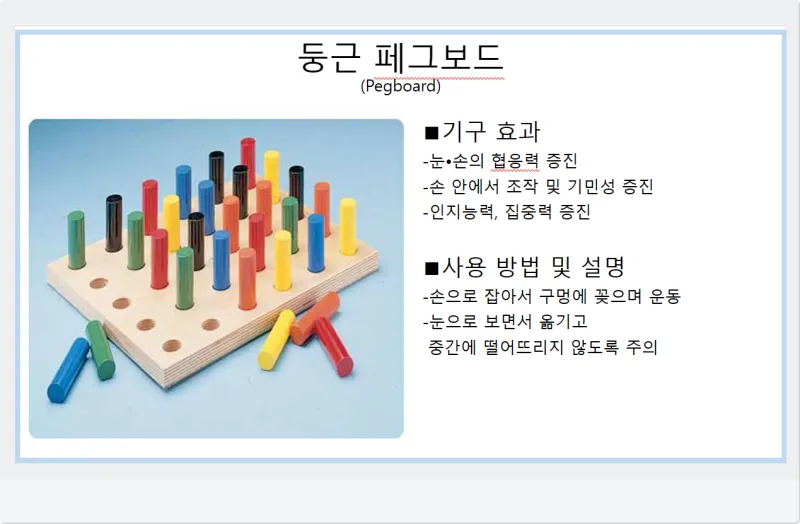 둥근 페그보드와 운동용 퍼티를 보여주고 있습니다.