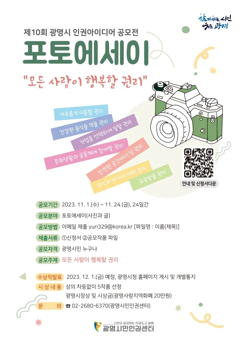 광명시민인권센터에서는 광명시민의 인권 증진과 인권 감수성 향상을 목적으로 1일부터 24일까지 ‘2023년 제10회 광명시 인권 아이디어 공모전’을 개최합니다!