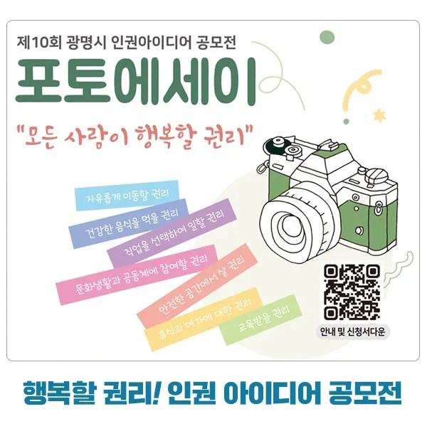 이번 공모전은 ‘모든 사람이 행복할 권리’를 주제로 글과 사진으로 구성된 ‘포토에세이’를 공모하며, 광명시에 거주하거나 광명시 소재 사업장에서 노동하는 사람 가운데 인권에 관심 있는 누구나 응모할 수 있습니다!