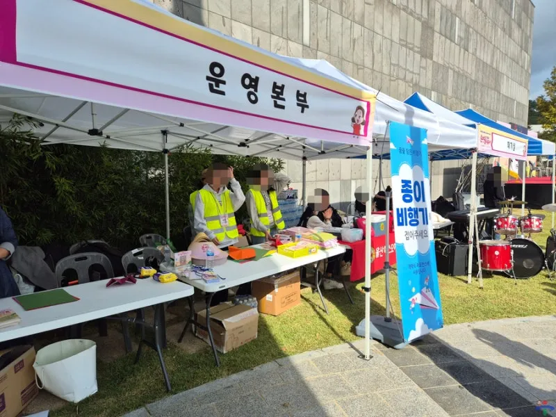 행사장 입구 쪽으로 들어서자 운영 본부가 자리하고 있었습니다. 이곳에서는 축제에 대한 정보와 스티커 투어 리플릿이 준비되어 있었고, 행사 때 함께 날릴 종이비행기 그리고 뜨거운 햇살을 가릴 수 있는 모자도 만나볼 수 있었습니다.