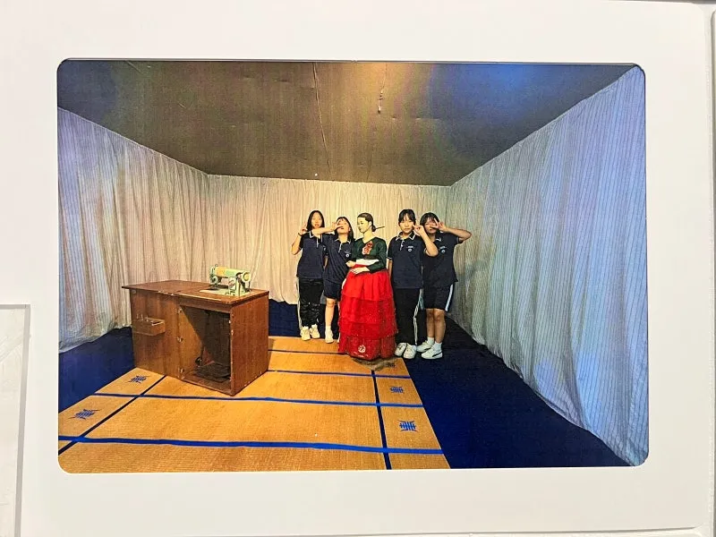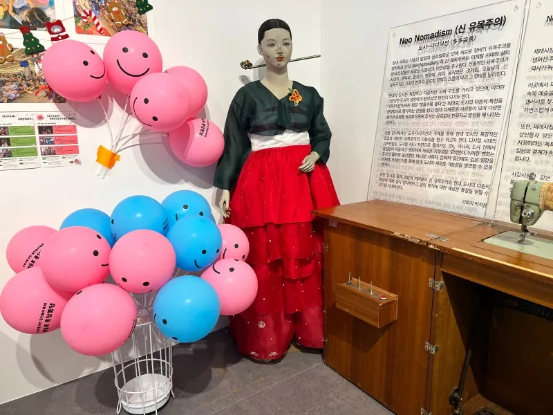 어린이는 창문아트센터 <네오 노마디즘>존에 전시되어 있는 조태경 작가의 한복을 입은 마네킹과 재봉틀 작품을 유심히 살펴보다가