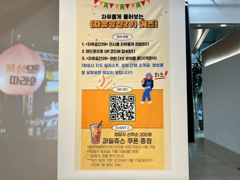 전시장 곳곳에 숨어 있는 퀴즈의 정답을 찾아 큐알 코드를 찍고 폼으로 작성해 제출하면 과일 주스를 선물로 증정해 준다고 합니다.