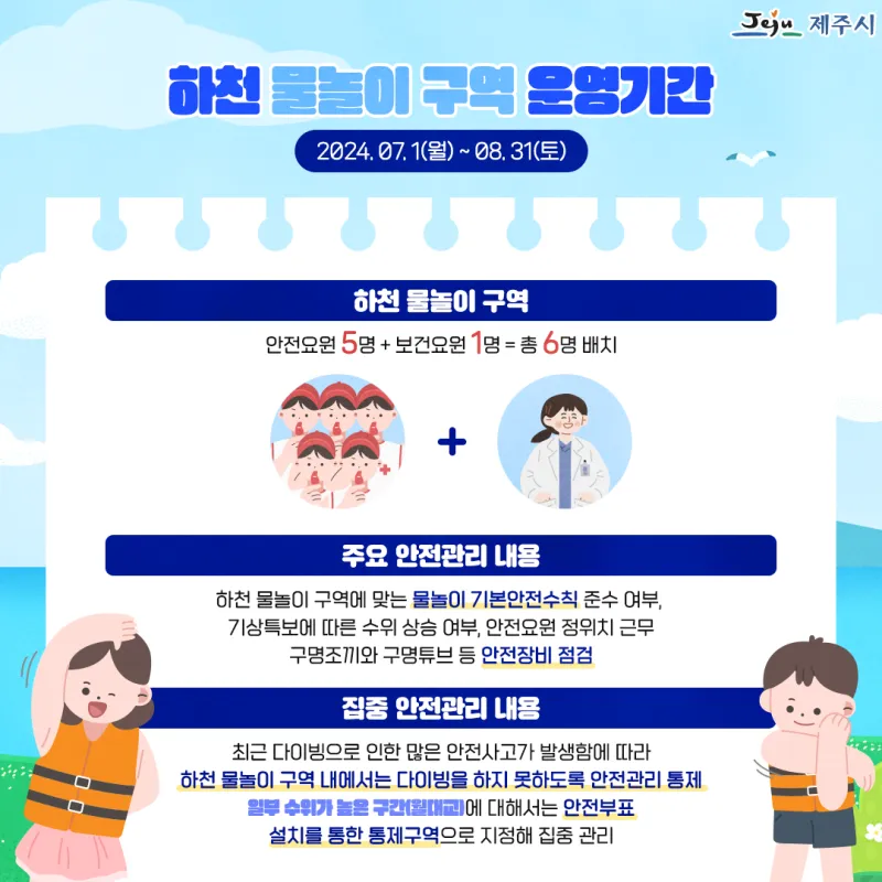 하천 물놀이 구역에 맞는 물놀이 기본안전수칙 준수 여부, 기상특보에 따른 수위 상승 여부, 안전요원 정위치 근무 구명조끼와 구명튜브 등 안전장비 점검 |